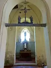 • Dans la base du clocher, une Vierge à l'Enfant en bois polychrome, fortement mutilée (manquent ses deux bras et la tête et les bras de l'Enfant), et une sainte Catherine accompagnée de la roue avec laquelle elle fut martyrisée, et piétinant l'empereur Maxence, sont placées de part et d'autre de l'arc diaphragme.