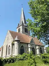 Le clocher est une tour carrée dénuée de caractère, sans contreforts, composé d'un étage intermédiaire aveugle, et d'un étage de beffroi, délimités par un bandeau plat, non mouluré. Sur chacune de ses faces, l'étage de beffroi est ajouré de deux étroites baies en plein cintre géminées. Les pourtours des baies sont moulurées d'une gorge, et le claveau au-dessus du mince trumeau, partagé par les deux baies, se termine inférieurement par un petit cul-de-lampe. La décoration se limite à ces détails. Ce clocher est indatable. Les parties orientales, assez homogènes, se caractérisent par un appareil de tout-venant, sauf pour les pourtours des fenêtres, agrémentés d'une gorge, et les contreforts. Très minces et peu saillants au sud, ils sont trois fois plus larges au chevet et aux angles de l'élévation septentrionale. Au nord, le contrefort central est de dimensions inouïes. C'est un massif de maçonnerie carré plus volumineux que la tourelle d'escalier à gauche du chevet, aussi large que l'intervalle entre ce contrefort et les contreforts d'angle. Son glacis sommital prend appui contre le pignon. Un larmier fait le tour des parties orientales à la limite des allèges, tout en incluant les contreforts, parti qui a cours entre le second quart du XIIIe siècle et la fin de la période gothique. Un larmier supplémentaire scande le gros contreforts du nord. Tous les contreforts s'amortissent par un glacis formant larmier.