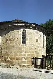 Édifiée en pierre de taille de belle facture assemblée en très grand appareil, l'église présente un chevet typiquement roman, au détail près que les baies ont été refaites en style ogival. Ce chevet, couvert de lauzes, est constituée d'une abside semi-circulaire unique couronnée d'une corniche saillante supportée par des modillons géométriques.