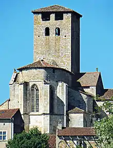 - Cinquième campagne datant du premier quart du XVIe siècle : l'abside romane est remplacée par un chœur plus vaste. Au-dessus des combles se trouve une salle fortifiée dont les meurtrières rondes furent appropriées à l'usage des armes à feu au XVIe siècle. La tour carrée massive de la croisée du tansept est crénelée à son sommet.