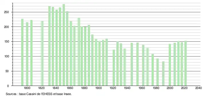 L'évolution du nombre d'habitants est connue à travers les recensements de la population effectués dans la commune depuis 1793. Pour les communes de moins de 10 000 habitants, une enquête de recensement portant sur toute la population est réalisée tous les cinq ans, les populations légales des années intermédiaires étant quant à elles estimées par interpolation ou extrapolation[20]. Pour la commune, le premier recensement exhaustif entrant dans le cadre du nouveau dispositif a été réalisé en 2006[21].