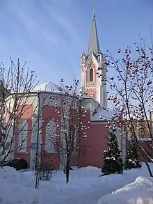 L'église souffre de l'incendie qui frappe la ville en 1875, mais elle est restaurée promptement et l'on construit en plus deux annexes, l'une pour la maison du pasteur, l'autre la maison paroissiale. La paroisse compte trois cents fidèles en 1878.