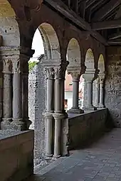 Cet édicule, indépendant du reste de l'édifice et recouvert d'une charpente, est ouvert à l'ouest par six arcades à claveaux plats encadrant une porte en plein cintre garnie de deux boudins évidés et d'un rang de trous cubiques soutenus par une colonnette centrale que flanquent cinq fûts de colonnes en délit ; ces fûts sont retenus par des bagues de pierre à mi-hauteur. Les graciles colonnettes des arcades, à la base aplatie, parlent de larges chapiteaux garnis de feuilles d'arum.