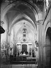 " Cet édifice se compose d'une nef, flanquée de deux bas-côtés sans fenêtres, d'un transept et d'un choeur carré. Il mesure 26 mètres de long ; la nef a 15 m 50 et le transept 17 m 90 ; la largeur de la nef est de 6 m 06, celle du choeur de 5 m 25 ; la voûte du transept est posée à une hauteur de 7 m 88.
