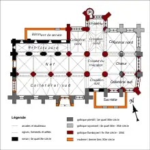 | Début de la construction | années 1120 (bas-côté nord sauf dernière travée, croisillon sud) ; 1re moitié XIIIe siècle (collatéral sud de la nef, chœur et 1re travée du collatéral sud du chœur) ; 4e quart XIIIe / XIVe siècle(collatéral nord du chœur) |