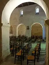 Chacun des deux murs latéraux est percé de quatre arcades en plein cintre, qui sont à angles vifs, non chanfreinés comme à Cinqueux, et retombent sur des piliers rectangulaires sans chapiteaux. Vers l'intérieur des arcades, ils sont garnis d'impostes non moulurés, et reliés aux piliers par un chanfrein. Celui-ci est gravé de lignes brisées (c'est-à-dire, en zigzag), délimitées horizontalement par deux lignes horizontales, une en haut et une en bas, ou deux lignes ondulées. Les triangles et, dans le deuxième cas, les segments de cercle ainsi circonscrits sont excavés, ce qui permet de dire que les impostes sont sculptés. Ce n'est pas encore le cas à la Basse-Œuvre de Beauvais, qui est préromane et date du Xe siècle. Les bases dégagées en 1970 sont adoucies par un tore, et se limitent sinon à une simple plinthe. Les fenêtres sont alignées au-dessus des sommets des grandes arcades et situées assez haut. Elles s'ouvrent au-dessus d'un long glacis et ne sont sinon pas ébrasées, les jambages étant orthogonaux aux murs. Il n'y a, évidemment, pas de fenêtre au niveau du clocher, qui se situe au-dessus de la dernière grande arcade au nord. En lieu et place de la fenêtre, on y trouve une porte d'un type archaïque, avec un linteau monolithique supportant un tympan nu sous un arc de décharge en plein cintre. Les escaliers en colimaçon pour accéder aux clochers ne se généralisent qu'au cours du XIIe siècle. Le revers de la façade occidentale présente une porte rectangulaire à double vantail, qui s'ouvre sous une arcade en plein cintre surhaussé, dont la partie supérieure est bouchée par le linteau et le tympan, nettement moins épais que le mur. Deux assises en opus spicatum séparent les claveaux de l'arcade d'une fenêtre en plein cintre, qui est un peu plus grande que les sept autres fenêtres de la nef. À droite de la porte, une plaque commémorative maintient la mémoire du baron Bich, mort en 1994. Quant à l'arc triomphal, il est à double rouleau et en cintre surbaissé, et retombe sur deux impostes du même type que ceux des grandes arcades. Aux deux tiers de leur hauteur, les jambages présentent un chanfrein qui répond aux impostes, et en dessous, les piliers sont donc un peu plus forts[27].