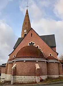 Le monument est construit en brique sur un soubassement de grès. Les ouvertures sont soulignées par un encadrement de pierre. Le plan s'éloigne du plan basilical traditionnel mais conserve les trois éléments : nef, transept et chœur. La façade est percée d'un portail protégé par un auvent décoré d'un crucifix. Une large baie vitrée surmonte le portail. Un clocher-tour flanque l'entrée côté sud. La particularité architecturale de ce clocher, qui culmine à 36 m de hauteur, est sa flèche qui prend la forme d'un obus - cas unique en France - rappelant ainsi les ravages de la Première Guerre mondiale dans ce secteur[2].