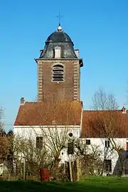 Le clocher en briques comporte quatre niveaux[3] et présente sur toute sa hauteur des chaînages d'angle en pierre bleue ainsi que de nombreuses ancres de façade.