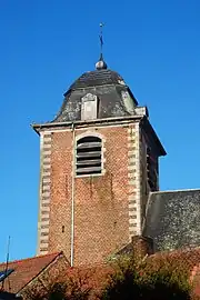 Le clocher est recouvert d'une toiture à l'impériale (toiture à courbe et contre-courbe), dotée d'une lucarne sur chaque pan[3].