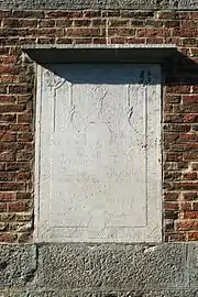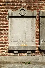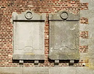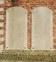 Sur la façade sud sont fixées deux grandes plaques en pierre bleue à la mémoire des morts des deux Guerres mondiales.