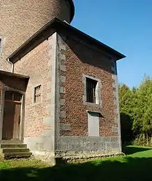 Le chevet est prolongé dans l'axe par une petite sacristie de plan carré réalisée dans les mêmes matériaux et percée de petites fenêtres carrées à encadrement de pierre bleue, dont l'axiale possède des montants à deux harpes[3]. Au sud, le chevet est partiellement caché par une seconde sacristie, plus basse et plus récente[3].