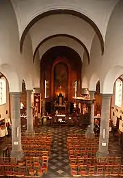L'intérieur, de style classique, présente deux parties très contrastées : le chœur réalisé en briques rouges et la nef peinte en blanc.
