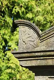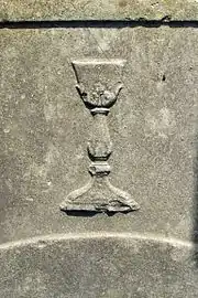 Un grand fragment de dalle brisée gisant dans la pelouse, au nord de l'église, est orné d'un bas-relief figurant un calice.