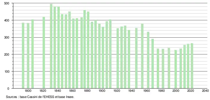 L'évolution du nombre d'habitants est connue à travers les recensements de la population effectués dans la commune depuis 1793. Pour les communes de moins de 10 000 habitants, une enquête de recensement portant sur toute la population est réalisée tous les cinq ans, les populations légales des années intermédiaires étant quant à elles estimées par interpolation ou extrapolation[22]. Pour la commune, le premier recensement exhaustif entrant dans le cadre du nouveau dispositif a été réalisé en 2006[23].