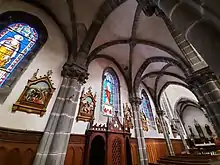 Sur la partie gauche de la nef, se tient une chaire en bois. Y sont sculptées les silhouettes de saints catholiques dont saint Joseph, saint Ambroise et saint Antoine.