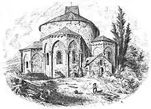 L'église, à coupole sur polygone jusqu'en 1960, date de l'effondrement de celle-ci, 14 m de diamètre et 15 m de hauteur, comptait trois travées de plus qu'aujourd'hui. Son plan est original en Dordogne ; trois absidioles polygonales, nord-est, est et sud-est, sont orientées de façon symétrique quoique désorientées : comme pour l'église de Montagrier, les deux bras du transept sont formés par les absidioles disposées à 143 degrés.
