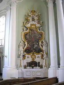 Le maître-autel datant de 1754-1755 est des mains de Nikolaus Schütz, d'après un dessin de Dominikus Zimmermann. Sa structure de bois est ornée de stucs. Les statues sont l'œuvre de Johann Luidl. Quatre piliers de stuc en trompe-l'œil imitant le marbre s'élèvent en se transformant en rocailles, flammes et coquilles, l'ensemble étant orné d'arabesques. La scène centrale représente le Baptême du Christ par saint Jean, sous une colombe symbolisant le Saint Esprit. Le décor du Jourdain est peint sur les murs.