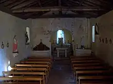 On peut noter la présence de peintures sur le mur de séparation de la nef et du chœur, ainsi que sur les murs de la nef. Celles-ci portent la date de 1522. Le décor s'organise en bandes verticales sous la forme d'ornements de couleur rouge, à caractère géométrique, représentant des croix, le soleil et un coq. Il y a aussi la présence de croix de Malte.