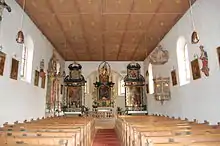 Son plafond à caissons est remarquable avec des rosettes dorées. Il cache la charpente. L'abside derrière le maître-autel a trois côtés. Le côté ouest de l'église est coiffé d'un clocheton couronné d'un bulbe typique. La sacristie se trouve du côté sud du chœur. La chaire baroque de bois est décorée des symboles des apôtres.