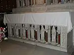 L'ancien maître-autel est en marbre blanc avec six colonnettes en marbre rouge.