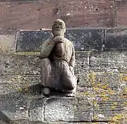 Quatre statues, appelées marmousets, représentant des hommes accroupis se trouvent sur les glacis de la tour de croisée. Leur signification n'est pas certaine[5]. Au-dessus du porche d'entrée se trouve le tympan : le Christ est représenté trônant et bénissant. Il est entouré de saint Léger et de la Vierge. Cette dernière est représentée couronnée puisqu'elle est la reine des Cieux. Saint Léger, lui, est représenté nimbé. Il tient un phylactère qui devait originellement être peint.
