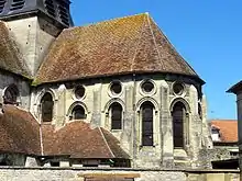 Le chœur est d'une facture assez singulière et ne manque pas d'élégance, mais ses murs n'apparaissent qu'au-dessus d'un mur qui clôture l'espace tout autour. Les contreforts se distinguent par un passage à une section polygonale à mi-hauteur des fenêtres et par la complexité de leurs volumes. Les fenêtres s'ouvrent au-dessus de longs glacis fortement inclinés. Elles sont à lancette simple, cantonnées de colonnettes à chapiteaux et surmontées d'une archivolte torique et d'un rang de dents de scie. Au-dessus, s'ouvrent des oculi moulurés, sauf pour la première fenêtre à l'ouest, qui monte plus haut[8].