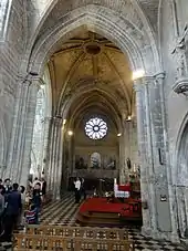 Depuis le transfert du maître-autel dans la croisée à la suite de la réforme liturgique issue du concile Vatican II, le chœur proprement dit n'est habituellement plus utilisé. Sa première travée carrée est des mêmes dimensions que la croisée du transept. Elle est bordée par deux longs rangs de stalles, au nord et au sud. Sa seconde travée, qui comporte une partie droite et l'abside polygonale, est habillée de boiseries peintes, et abrite notamment l'ancien maître-autel richement décoré. Au sud de cette travée, une porte à double vantail intégrée dans les boiseries donne accès à une seconde sacristie. Le chœur est donc dépourvu de collatéraux, mais la travée droite communique au nord avec la chapelle de la Vierge, moyennant deux grandes arcades en cintre surbaissé, retombant au centre sur une colonne cylindrique libre. La travée droite est ainsi subdivisée en deux demi-travées, comme le veut sa voûte sexpartite. Son doubleau intermédiaire retombe sur des culs-de-lampe de la forme d'un chapiteau de feuillages. Le voûtement sexpartite crée latéralement des formerets hauts et aigus, ce qui permet de pousser plus haut les fenêtres. Ainsi, le seuil des deux fenêtres hautes du sud se situe effectivement au niveau des chapiteaux de la voûte. À l'instar des fenêtres du croisillon sud, ces fenêtres s'ouvrent sous une archivolte torique et entre deux colonnettes à chapiteaux. Cette décoration ne fait pas de distinction entre la baie unique au début du chœur, et les lancettes simples surmontées d'un oculus qui règnent à partir de la seconde fenêtre. Au-dessus des arcades vers la chapelle de la Vierge au nord, aucune trace d'ouverture n'est visible au-dessus de la première arcade, et au-dessus de la seconde arcade, le couple lancette simple / oculus est bouché. Comme il ressort de cette description, la travée droite a donc des élévations différentes au nord et au sud[9].
