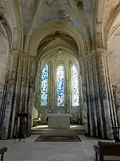 Malgré sa profondeur modeste, le chœur est subdivisé en deux travées par un doubleau intermédiaire. Celui-ci repose sur deux faisceaux d'une colonnette et de deux très fines colonnettes, de diamètre moindre que les colonnettes du transept. L'assiette des tailloirs est donc trop petite pour accueillir les formerets, qui sont reçus par des culs-de-lampe à côté des chapiteaux. Côté ouest, les culs-de-lampe ne sont décorés que de quelques nervures, alors qu'ils sont enveloppés de feuillages côté est. Il est à noter que tous les fûts de colonnettes du chœur sont appareillés, et non en délit. Leurs socles reposent sur le soubassement des fenêtres, en bas du glacis fortement incliné qui se trouve au seuil de chacune des baies. Cette disposition assez rare doit dater d'origine, à moins que le soubassement des fenêtres ait été renforcé. Elle peut s'expliquer par le souci d'éviter la montée de l'humidité dans les fûts, et deux arcs de décharge en bas du mur septentrional servent sans doute à enjamber des sources. Un troisième arc de décharge se trouve au sud de l'abside. Malgré ces précautions, la partie inférieure des colonnettes du doubleau a dû être supprimée. Le profil des ogives est différent du transept, et consiste d'un tore légèrement aigu entre deux baguettes. Le profil du doubleau est également différent, car le méplat entre les deux tores est remplacé par une gorge peu prononcée. Les clés de voûte ont été raccommodées à force de plâtre, et le décor ne subsiste qu'en partie. Dans l'abside, une tête se détache entre deux ailes ou deux feuilles, mais la clé de voûte proprement dite est nue[5].