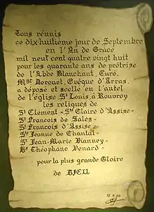 L’autel en marbre de façon stylisée une berline en marche et renferme différentes reliques comme l’indique un parchemin portant ce texte :