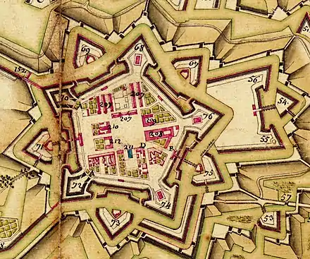 L’église est mentionnée par le numéro 211 sur la carte ci-dessus (en bleu foncé), carte orientée conventionnellement nord-sud. Elle est tournée vers la place centrale, à côté du logement de l’aide major et de l’artillerie.