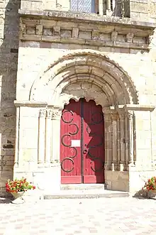 Le portail polylobé présente quatre colonnettes à chapiteau de chaque côté. La porte de chêne du XVIIIe siècle est couverte de dix pentures en fer forgé en forme de fers à cheval terminés par des têtes de serpents.