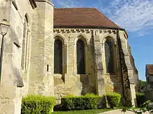 Extérieurement, le transept et le chœur se présentent comme un ensemble homogène de la fin du XIIe et du début du XIIIe siècle, mais les restaurations sont nombreuses. À l'exception des pignons du transept, les murs sont soigneusement appareillés en pierre de taille. Les contreforts des croisillons sont à trois glacis formant larmier ; ceux du chœur comptent un glacis supplémentaire. Les fenêtres sont à ébrasement extérieur, et généralement flanquées de deux fines colonnettes en délit. C'est une marque de raffinement et d'élégance, qui semble conforter l'hypothèse de l'existence ancienne de colonnettes en délit dans les angles de l'abside. Là où les fûts ont disparu, ils n'ont pas été remplacés lors des restaurations. Les chapiteaux de crochets ou de feuilles plates restent tous en place. Sur le chœur, où les fenêtres sont rapprochées, une tablette moulurée continue tient lieu de tailloir. Elle supporte des archivoltes simples, qui sont moulurées d'un tore dégagé, et surmontées d'un rang de têtes de clous sur les croisillons seulement (cet élément du décor s'étant perdu à l'est du croisillon sud, et la baie septentrionale du croisillon nord est de toute façon un grand oculus du XVIe siècle). La basilique de Larchant et l'église de Vétheuil possèdent des fenêtres identiques. Les corniches des croisillons ne subsistent plus qu'à certains endroits. Elles sont formées d'une tablette reposant sur des modillons sculptés de masques. La corniche du chœur est toujours complète, et particulièrement remarquable. Ici, des ovales allongées, taillées en biseau, s'insèrent entre les modillons. Le chœur de Longuesse arbore une corniche identique, ce qui souligne encore les liens de parenté entre les deux églises, déjà mis en relief par l'examen intérieur. On la retrouve également à Seraincourt, ou, dans une forme plus archaïque et sans modillons, sur l'absidiole nord de Condécourt. Dans le contexte de Seraincourt, Aimée Rivière indique l'origine lombarde de cette forme de corniche[8].