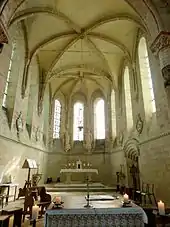 Toujours sur le plan des remaniements, il convient de signaler le remplacement des faisceaux de colonnettes près du doubleau vers la croisée du transept par des massifs de maçonnerie obliques jusqu'à deux tiers de leur hauteur, et la forte détérioration des fûts, voire leur disparition complète, au-delà. Les chapiteaux et tailloirs demeurent néanmoins indemnes. Leur confrontation aux autres chapiteaux du chœur met en exergue le caractère néogothique de ces derniers, sauf certains chapiteaux des formerets. Les plus originaux sont ceux situés dans les angles près du transept. L'un représente une chauve-souris, et l'autre une chouette. Tous les autres motifs sont végétaux. Il n'y a pas de rupture stylistique avec le transept. Le profil des ogives est le même que dans les croisillons, tandis que le doubleau est mouluré de trois tores accolés, ce qui est plus rare. Les colonnettes des formerets ont les mêmes bases que celles autour de la croisée du transept. Les deux clés de voûte sont malheureusement néogothiques. Ce remplacement des clés de voûte est une exception lors des restaurations du XIXe siècle, car les clés non armoriées des XIIe et XIIIe siècle ont généralement traversé les siècles sans dommages, et n'ont pas été mutilées sous la Révolution. Comme légère différence avec les croisillons, l'on peut signaler l'absence d'ébrasement des fenêtres, qui s'ouvrent en revanche au-dessus d'un long glacis encore plus pentu. Une curiosité architecturale est la décoration de l'archivolte de la porte bouchée du côté sud, qui devait assurer l'intercommunication avec le prieuré. Son arc en anse de panier est surmonté d'un tore et d'un rang de rinceaux, et son intrados est mouluré de quatre tores logés dans des gorges, qui sont séparés par des angles rentrants. Les cinq tores sont réceptionnés sur les tailloirs de modillons sculptés de masques humains, où des feuillages tiennent lieu de cheveux. Ces œuvres évoquent la sculpture flamboyante, mais étant donné leur état de conservation, ne devraient pas être antérieures à 1883.