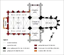 | Autres campagnes de travaux | 1693 (réparation des voûtes du transept et du chœur) ; dernier quart XIXe siècle (restauration nef) | ||