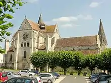D'orientation irrégulière nord-est - sud-ouest, l'église se compose d'une nef de quatre travées accompagnée de deux bas-côtés, d'un transept largement saillant dont chaque croisillon comporte deux travées successives ; et d'un chœur au chevet plat, flanqué de deux collatéraux. La quatrième travée de la nef est de plan trapézoïdal, car devant réunir la nef romane très étroite à la partie gothique de l'église, sensiblement plus large. L'extérieur de cette quatrième travée est irrégulier et permet encore aisément de voir qu'elle est issue de la transformation de l'ancien transept roman. Une petite flèche en charpente se dresse au-dessus de la croisée du transept. Les cloches se trouvant dans les combles, quatre lucarnes avec des baies abat-son ont dû être placés tout autour aux angles de la toiture, souvent confondues avec des pigeonniers. L'église possède deux tourelles d'escalier d'une envergure considérable et d'une architecture soignée. La première, aussi appelée tour Sainte-Barbe, se trouve à droite de la façade principale sud-ouest et est de style roman ; la seconde se trouve à l'angle entre le croisillon sud-est et le chœur et est de style gothique. Deux portails donnent accès à l'église ; tous les deux romans, ils se trouvent sur la façade principale et le bas-côté sud-est[4],[5].