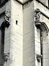 Angle sud-est de l'ancien croisillon sud, avec des frises et une tête sculptée.