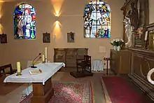 L'intérieur de l'église est éclairé par six fenêtres (trois de chaque côté) occupées par des vitraux. La voûte de l'église est en plein cintre.