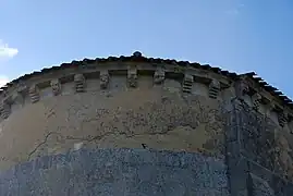 Les modillons de la façade ouest soutiennent une entablement décoré avec des cercles. Certains modillons sont érodés ou ont souffert de dégradations délibérées.
