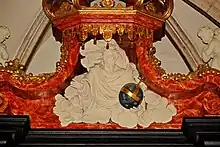 - un grand dais à volutes et à lambrequins flanqués d'angelots et encadrant la figure en stuc de Dieu le Père portant l'orbe, un globe coiffé d'une croix symbolisant sa domination sur le monde ;