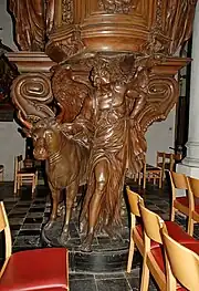 La chaire en bois de chêne n'est pas adossée à un pilier de la nef comme s'est souvent le cas mais est portée par un remarquable groupe sculpté composé de figures du tétramorphe : l'homme ailé ou l'ange, l'aigle et le taureau (les symboles traditionnels des quatre évangélistes). Sa cuve est décorée de panneaux sculptés et surmontée d'un abat-voix orné de la représentation du Saint-Esprit entouré de rayons de lumière.