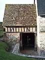 Il subsiste un vitrail de 1537[3], fabriqué dans la verrerie de la Fontaine-du-Houx. De petites dimensions, il s'agit d'une « Annonciation ». Au bas du vitrail et en premier plan sont agenouillés, face à face, un gentilhomme, revêtu de son armure, tête nue, l'épée au côté. Son épouse, en longue robe violette aux manches d'hermine, comme lui, a les mains jointes. Derrière eux leurs armoiries respectives : « d'or à trois roses de gueules » pour lui et « de gueules à trois chevrons d'or » pour elle. Au-dessous, il est écrit en deux lignes de caractères gothiques : « Ci-gisent nobles personnes Jehan de Caqueray escuier et damoiselle Bouju sa feme lesquels trepasserent au mois de mars en caresme 1537 priez Dieu pour eulx ».