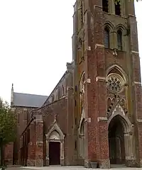 La nouvelle église fut construite à l’initiative de l'abbé L. Couvreur, curé de la paroisse de 1881 à 1905, en brique en style néo-gothique très prisé à l'époque, selon un plan basilical traditionnel avec nef à deux bas-côtés, transept et chœur. Le clocher-porche est surmonté d'un toit en flèche. La façade principale est percée de trois portails ; le portail central est abrité par un porche surmonté du clocher.