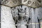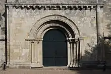 Au-dessus du portail la corniche est formée par un treillis végétal continu sur toute la largeur de la façade. Ce superbe encorbellement est scandé par quinze modillons et deux pairs de chapiteaux, suivant la formule décorative qui a été calquée sur la façade de l'Abbaye mère de Sainte-Croix à Bordeaux. Il date de 1150.