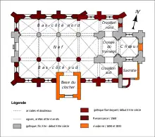| Autres campagnes de travaux | début XVIe (reconstruction dernière travée des bas-côtés et croisillons) ; 1568 (grandes arcades du sud et voûtes de la nef et des bas-côtés) ; 1833 (clocher-porche) | ||