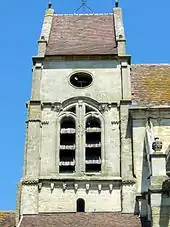 Le style hétéroclite de l'étage de beffroi peut faire oublier que le clocher remonte à la période romane, jusqu'à la corniche partiellement conservée qui sépare cet étage du troisième étage ajouté en 1580. Les contreforts plats et les corniches de modillons sculptés en masques qui terminent le premier étage ainsi que l'étage de beffroi trahissent bien le style roman, mais l'archivolte torique commune aux deux baies abat-son gémelées par face et les écoinçons ajourés sont évidemment incompatibles avec cette période. — Le premier étage possède une unique baie en plein cintre par face vers la nef et vers les croisillons, mais deux vers le chœur, où elles sont du reste toujours visibles quoique murées. Ces baies sont non décorées et généralement centrées, sauf vers la nef. Ici la baie a toujours été obturée par la toiture et n'est pas centrée pour éviter le poinçon de la première ferme de la charpente. L'on accède au clocher par les combles de la nef et une porte au linteau en bâtière sous un arc de décharge, à côté de la baie mentionnée. Les seuils des autres fenêtres concordaient avec le faîtage des toits des croisillons et du chœur roman. Seule celle du sud demeure intacte. En haut de l'étage, les modillons portent une tablette, et deux rangs de billettes disposés en damier ornent les contreforts. Par un double glacis, les murs du second étage se retraitent légèrement. Les baies étaient initialement cantonnées de colonnettes appareillées à chapiteaux, et surmontées de cordons de billettes qui se poursuivaient au niveau des impostes et couraient tout autour du clocher. Ils subsistent toujours sur les contreforts et partiellement sur les murs. En 1580, les chapiteaux ainsi que les archivoltes romanes ont été supprimés pour céder à un simple tore, du même diamètre que les colonnettes. Le mur au-dessus des baies a été abattu, et les trumeaux ont été prolongés afin de supporter une nouvelle archivolte commune aux deux baies. Cette archivolte transperce la corniche romane, dont la partie centrale disparaît donc. Entre la partie subsistante de la corniche et la nouvelle archivolte, des têtes de chérubins ailées caractéristiques de la Renaissance et du style baroque complètent les restes du décor roman. Il paraît que ce remaniement tente à imiter le nouveau clocher de l'église Saint-Sulpice de Chars, qui date de 1562. Jules Formigé n'exclut pas que le maître d'œuvre fut Nicolas Le Mercier car celui-ci travaillait alors sur l'église d'Ennery. Eugène Lefèvre-Pontalis s'interroge même s'il ne fut pas l'architecte du chœur. — Le troisième étage est ajouré d'un œil-de-bœuf sur chaque face. Les bases des pignons sont agrémentées d'une boule, et une croix en antéfixe couronne leur sommet. L'intérieur du clocher abrite un solide beffroi en charpente du XVIe siècle qui s'est bien conservé, et qui abrite trois cloches de 1865 / 1866. L'on n'y observe pas les trompes dans les angles qui auraient été nécessaires pour le recouvrement par une pyramide en pierre. Le clocher a donc toujours été couverte par une bâtière[27],[28].