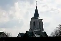 La tour carrée du clocher a sa silhouette épaissie par la présence à chaque angle de deux contreforts, dont la décoration supérieure consiste en un éperon surmonté par un pinacle appliqué sous un talus (biseau). Quatre larmiers tronçonnent la hauteur de la tour, pour en rompre la monotonie, en autant d'étages dont le dernier est percé sur chaque côté par une grande et haute baie à archivolte et ayant perdu le meneau qui la géminait.