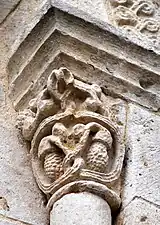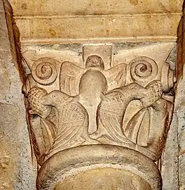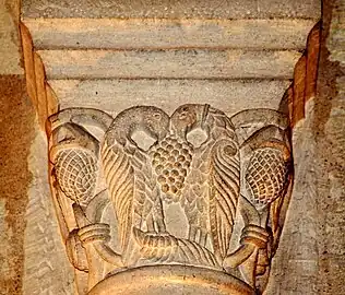 - Le chapiteau I : Deux oiseaux sur la face principale qui picorent une grappe de raisins ; les deux petites faces, qu sont symétriques, sont décorées avec un rinceau et une pomme de pin.