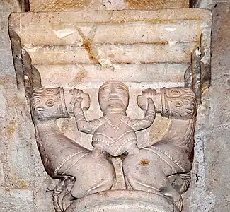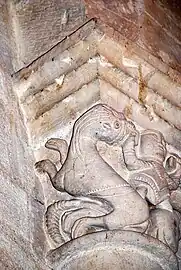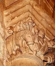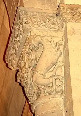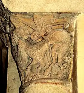- Chapiteau sud : Ce chapiteau est un exemple remarquable du thème classique de l'art roman : des animaux fantastiques qui crachent des rinceaux. Sur chaque petite face se trouve un lion rampant, la tête tournée vers la face principale. Leurs queues, d'abord rentrantes, puis remontantes, deviennent fleurdelisées et se mélangent avec les rinceaux et feuilles que les lions crachent de la bouche.