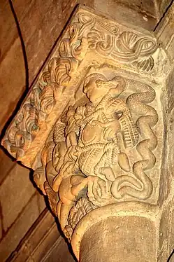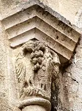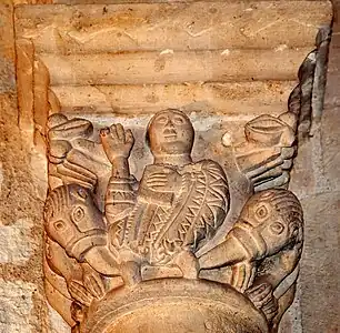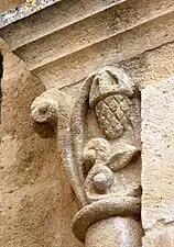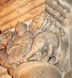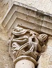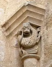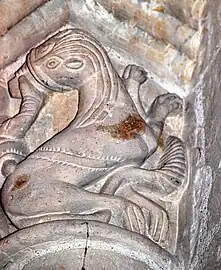 La sculpture du chapiteau nord de l'arc du chœur est exceptionnelle. Sur la face principale se trouve une créature féminine, hideuse et diabolique. Elle est nue, les deux paires de jambes écartées, son sexe bien visible et ses pieds en forme de serres. Au-dessus de sa tête une pomme de pin est suspendue et, sous ses pieds, des créatures serpentiformes s'enlacent.