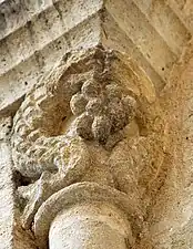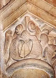 - Baie nord : À gauche, un masque diabolique sur l'angle de la corbeille crache des rinceaux. Sur le chapiteau de droite, deux oiseaux s'affrontent pour béqueter une grappe de raisin ou pomme de pin. L'archivolte est décoré avec des torsades.